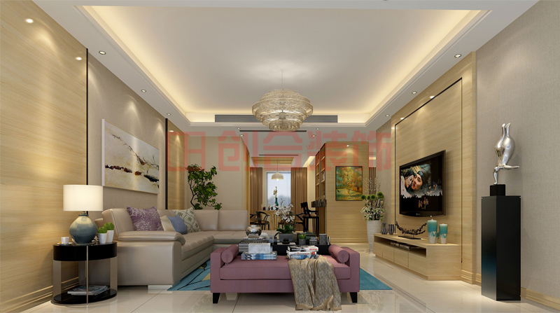 電視、沙發背景采用了大面積的淺楓色木飾面與黑鏡線條,營造出現代風格的線條感,公共區域運用灰色調的墻紙,使得整體空間呈現出時尚感。